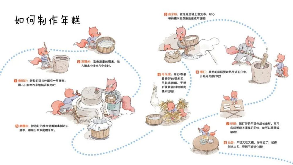 就拿《蒸年糕》这本来说吧,孩子看完书会大吃一惊:原来超市里随处可见的软糯糯的年糕,要经历这么多制作工序啊——