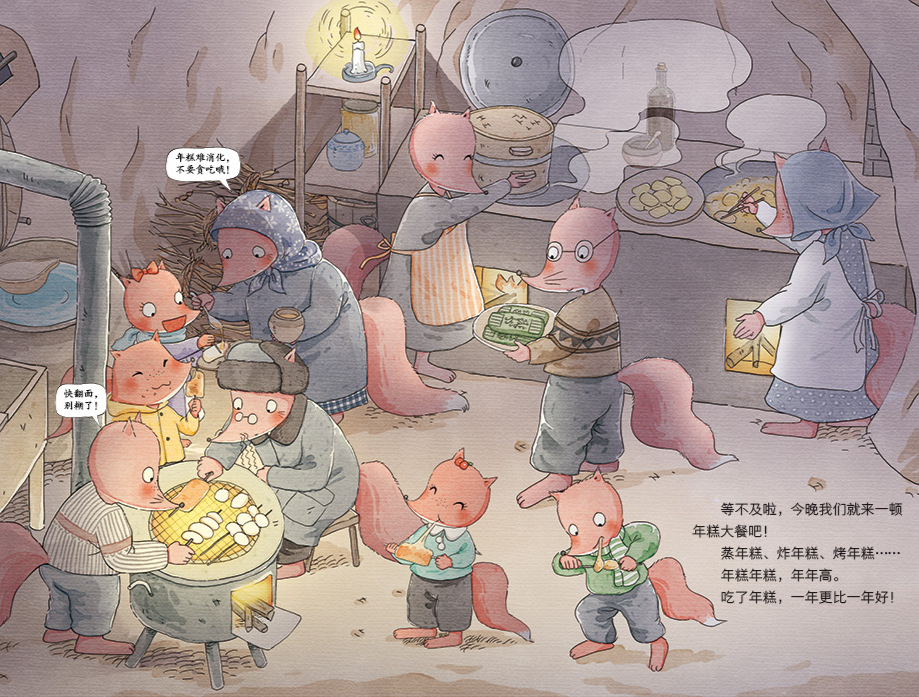 因为我看过“14只老鼠”系列,所以当我对比了这本《狐狸家蒸年糕》和日本的《14只老鼠捣年糕》才发现:
