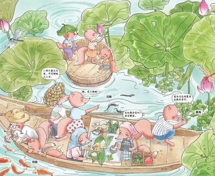 还有溪水里的鲤鱼、包粽子的箬叶、还没成熟的菱角、碧绿成片的荷叶、未绽放的荷花……