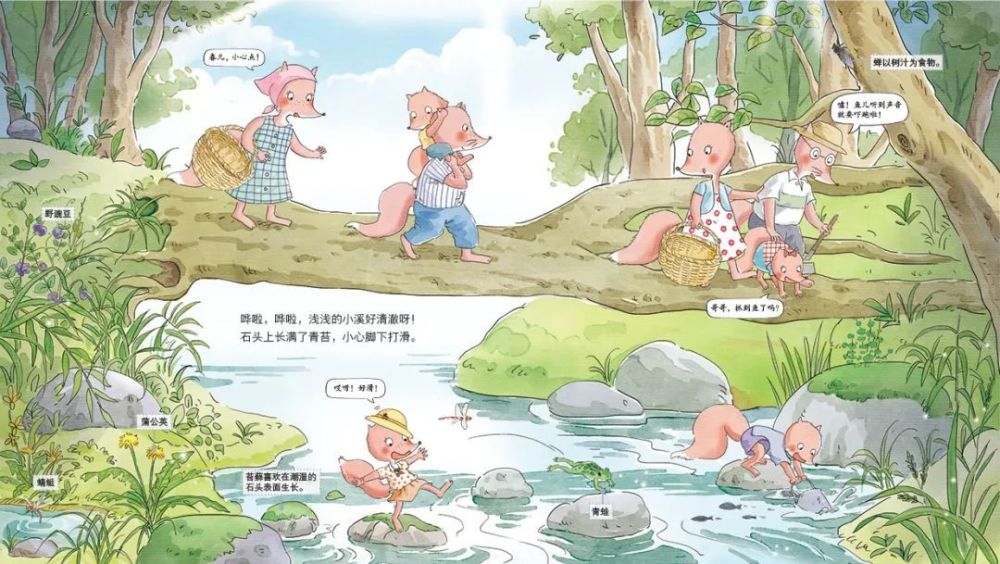 趁着雨过天晴,狐狸一家进林子了,林子里有蝉、蜻蜓、青蛙、蒲公英、湿滑的苔藓、野生的豌豆……