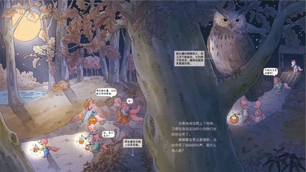 当圆月悄悄爬上了树梢,树林里的小动物都出来活动了:猫头鹰瞪圆了眼睛,野兔出来捕食,蟋蟀藏在草丛里唱歌……