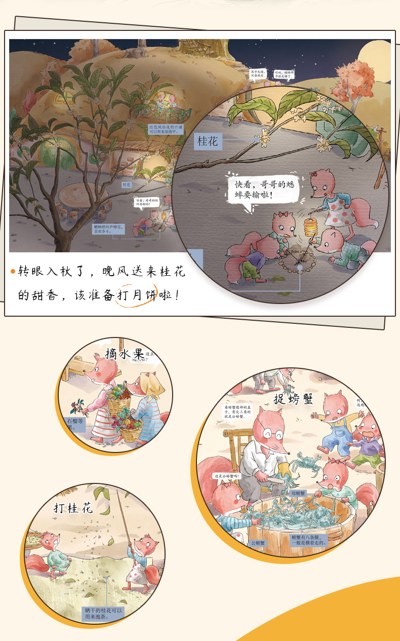 晚风还送来了桂花的甜香,橘子、苹果、山楂、石榴这些水果都成熟了,狐狸爸爸抓出来的螃蟹一只比一只肥……