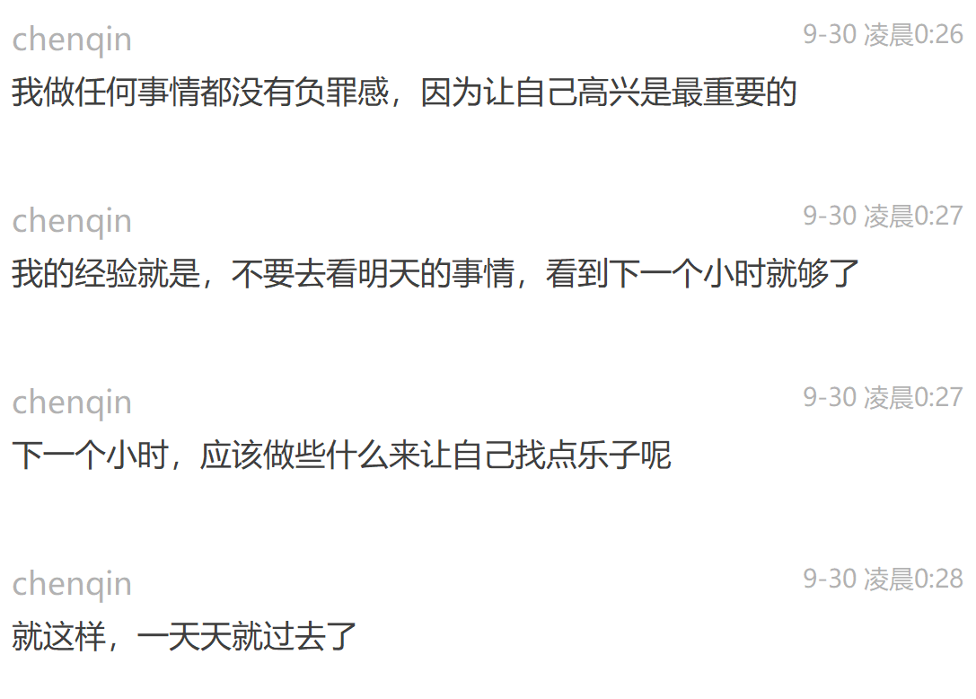 其实这完全是我的人生哲学。我跟很多好朋友都说过,我的人生完全没有既定目标,从来没想过十年以后要怎么样,一年以后要怎么样,甚至明天应该怎么样都很少去管。要去吃什么餐馆,一般都是这一秒钟灵机一动,下一秒钟打电话定餐馆,五分钟以后就在路上了。只要能过好下一个小时,你就会觉得人生真的好开心。