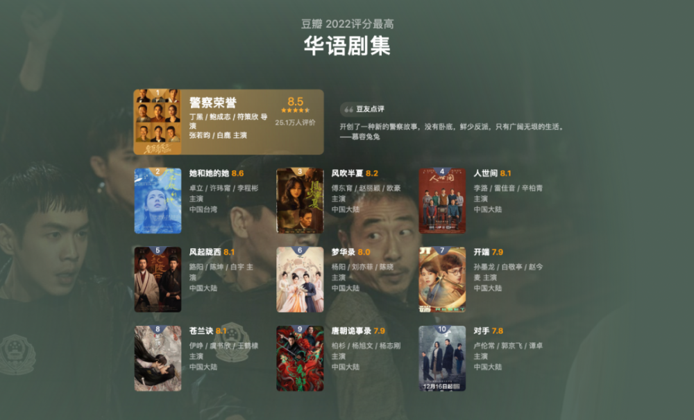据统计,2022年豆瓣高分剧集有所增加,这从侧面反映了各大制作公司和爱优腾的自制能力均有提升,根据豆瓣公布的2022评分最高的华语剧集Top10,我们看到三个趋势: