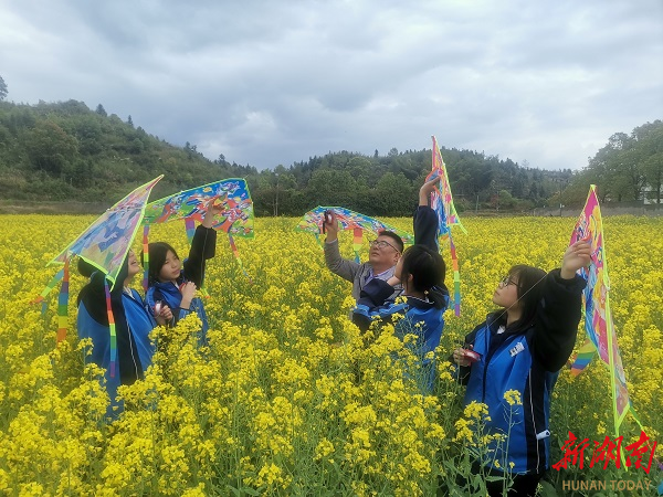 80余名学生趁着天晴,在老师的带领下走出校门,深入学校油菜种植基地。生物课开始了,周开明老师让每个学生摘下一朵油菜花,排放在观察记录本上,然后亲手教他们认识油菜花的结构,并教他们拿毛笔给油菜花授粉;语文老师杨圆则收集了描写油菜花的古诗词,带领他们吟诵,还改编成情景剧,在油菜花丛中上演;音乐老师缪英在花丛教唱《油菜花》这首歌,还让学生接龙串唱有关春天的歌曲;美术老师卢耀明带领学生在花丛中完成水彩画《油菜花》,劳动老师朱老师则带领同学们在花海中放风筝,综合实践周老师则带领学生开展“且听风铃花海猜谜的”活动。