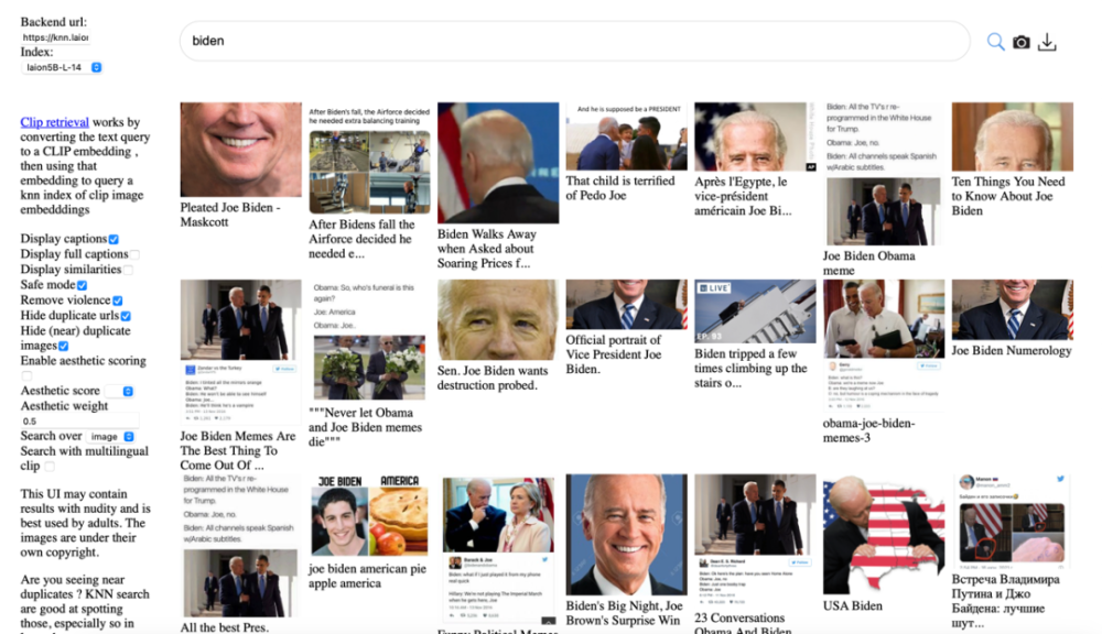 我们可以在LAION中,搜索任意关键词,看到它的“知识量”。如下图片,是以拜登为关键词搜索的结果。
