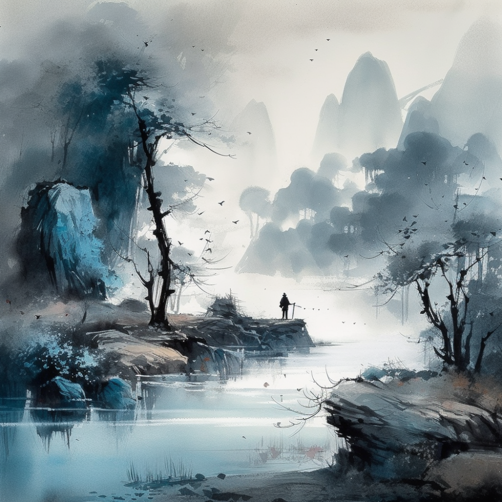 我选择了“诗中有画,画中有诗”的唐代诗人王维两句,“行到水穷处,坐看云起时”,要求Midjourney生成一张水墨画。