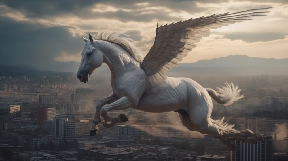 那就画一幅“天马行空”吧。Prompt为“一匹飞翔的马儿,正在城市上空奔跑。逼真。艺术感。有创造力的。”