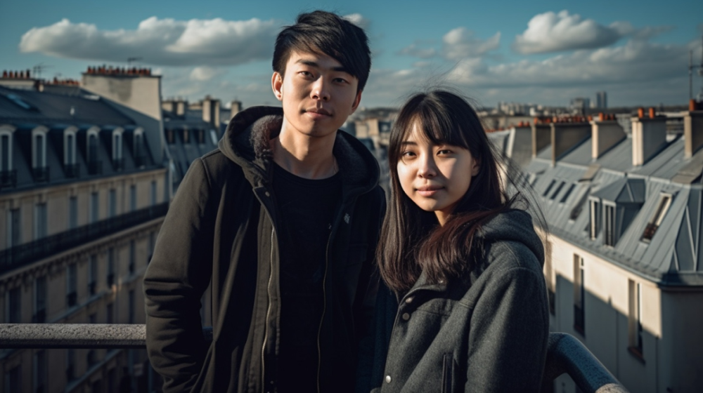 我试图复刻这组走红的照片,对Midjourney 输入Prompt:一对中国情侣,在一个屋顶天台上合影。地点是巴黎。