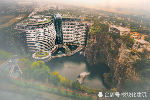 该酒店创造了全球人工海拔最低五星级酒店的世界纪录,下探地表88米开拓建筑空间,依附天马山深坑崖壁而建,被美国国家地理誉为“世界建筑奇迹”。