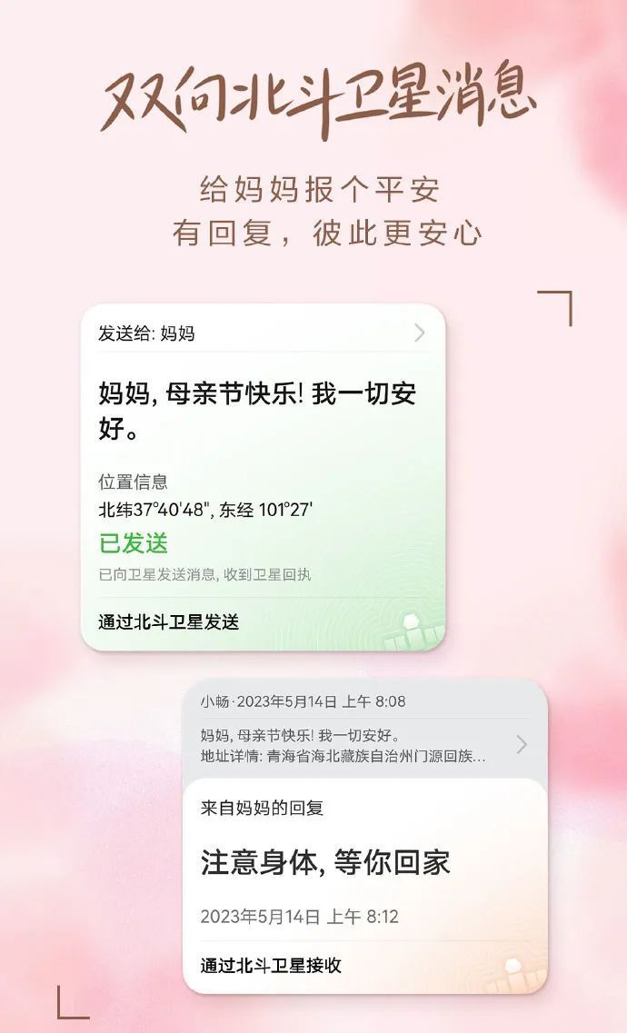 在“母亲节”这天,华为上线了北斗卫星定制消息,分别为“妈妈,母亲节快乐!我一切安好”“亲爱的,5201314!我一切安好”,即使你的手机没有信号,也能通过北斗卫星发送。