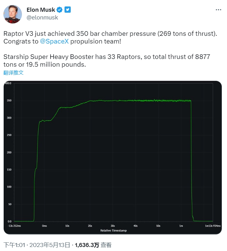SpaceX 第三代猛禽发动机(Raptor V3)已经完成了实验,可实现 35 MPa 的压力和269 吨的推力。再加上星舰一级超重型助推器会采用 33 台猛禽发动机,因此总推力可达 8878 吨。