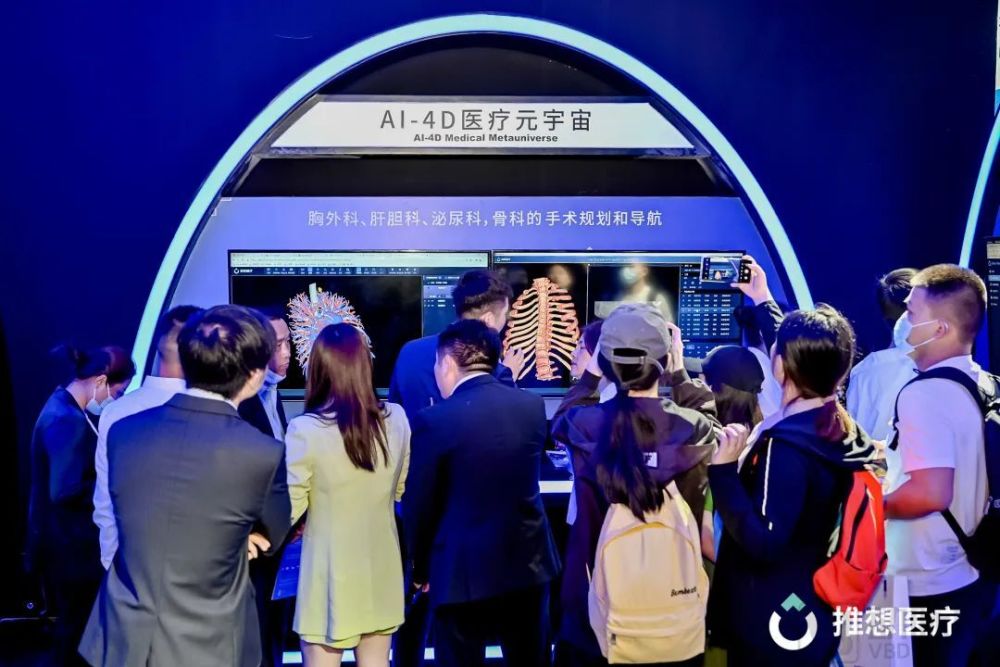 在推想医疗的展台旁,众人围着推想刚刚重磅发布的AI-4D平台讨论。该平台包括一系列重建和结构化报告解决方案,可助力医生进行手术规划。