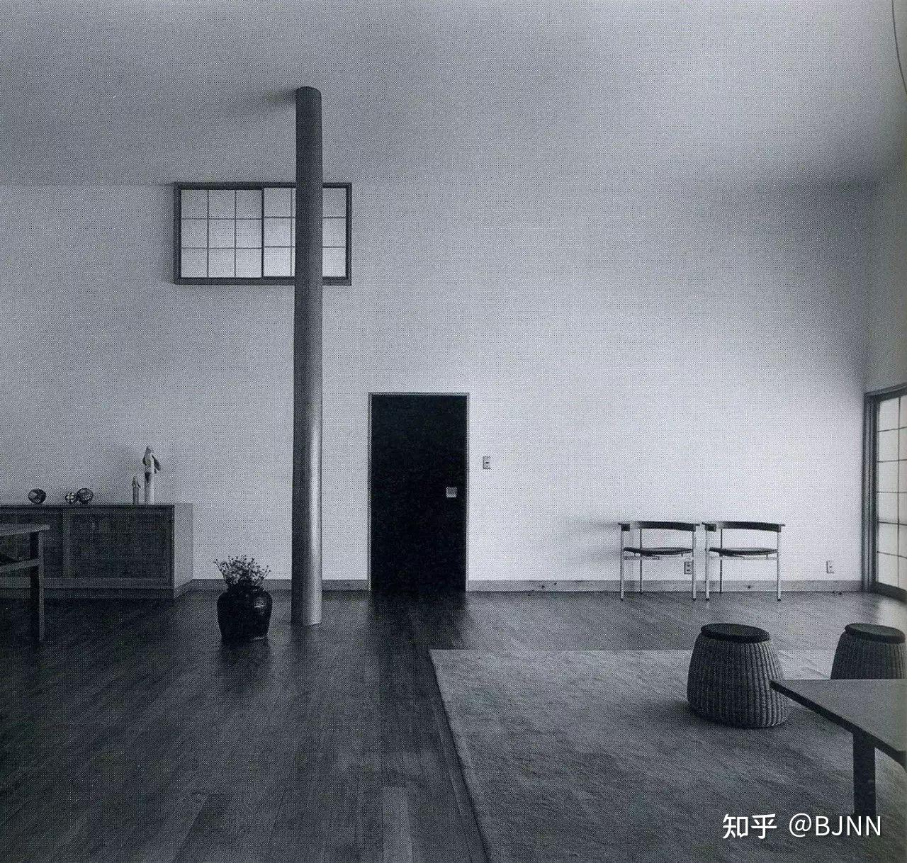 白之家从外面看是传统的日本房子,但是室内用一个吊顶把屋顶坡度封掉了,就留了一根中心的柱子,柱子位于正方形的房间的正中。平面上通过一堵墙的操作,把柱子的中心感去除了。柱子失去了结构支撑的作用,更多的是空间上的划分,和对日本传统建筑形式的继承。