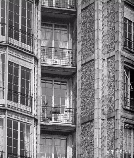 垂直窗到1930年代,佩雷开始直接暴露钢筋混凝土的框架结构梁柱,比如巴黎市政博物馆,他通过模板赋予混凝土柱子表面以竖线条的凹槽肌理,就像经典的陶立克柱式的柱身一样,但是这些柱子在室内空间里是直上直下、没有柱头的,而在室外门廊处又会在柱头处被放大以某种相对抽象纹理的柱式图案,并不是陶立克或爱奥尼样式的柱头,但是会给你产生和它们有关的联想。这个柱头完全是钢筋混凝土模板现浇出来的。