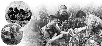 图⑤:梧桐沟边防连战士在“汗水地”里采摘番茄。
