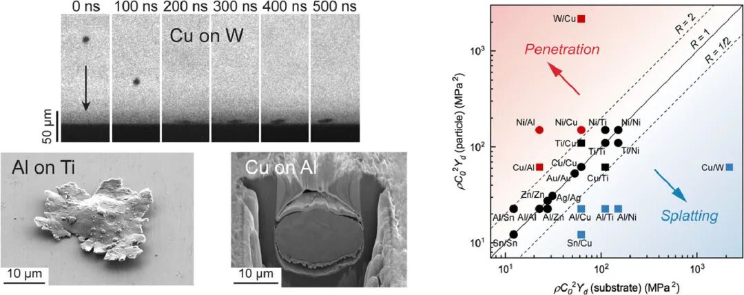 我们通过实验全面展现了高速运动的微粒冲击不同基材后,各种可能的变形状态。基于对撞击位置的实验观察,我们确定了三种典型的行为模式,即飞溅、共变形和穿透。我们开发一套理论框架来预测给定粒子/基体组合的行为模式,包括变形模式谱的两个极端——飞溅和穿透,以及中间的共变形。我们提出了一个基于材料性质的冲击比对以上模式谱进行量化。根据我们的理论模型,冲击比接近1时会发生共变形,而比值较大或较小时,将分别发生贯入和溅出。