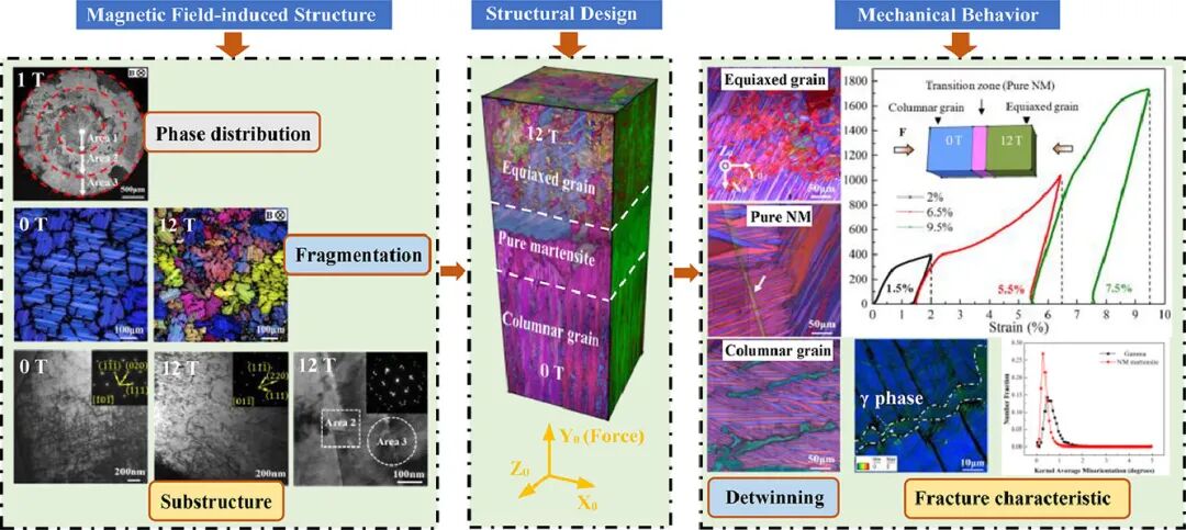 我们通过实验研究了轴向磁场对定向凝固镍锰镓合金组织的影响。研究发现,在磁场作用下,会出现γ相的径向梯度分布以及马氏体/γ相的晶粒破碎。事实上,在弱磁场(B≤2 T)下,可以观测到马氏体区、马氏体/γ相胞和共晶混合区。而在强磁场(B≥4 T)下,则会发生马氏体/γ相的晶粒破碎。此外,强磁场的应用会引起马氏体的结构畸变和γ相内部的位错重排。基与以上结果,我们利用磁场辅助定向凝固技术成功地制备了具有柱状和等轴晶的独特样品。随后,我们研究了Ni-Mn-Ga样品在压缩载荷作用下的力学行为和脱孪演变,并提出了一个基于施密德因子和变形梯度张量的通用判据来解释压缩应力诱导的脱孪演化。γ相显著提高了柱状晶和等轴晶的力学性能。特别是,γ相的随机分布更利于阻碍断裂,导致多晶Ni-Mn-Ga试样压缩应变增大。这项工作突出了磁场对材料组织的影响,并为含γ相的Ni-Mn-Ga合金的脱孪机制提供了更加深入的理解。