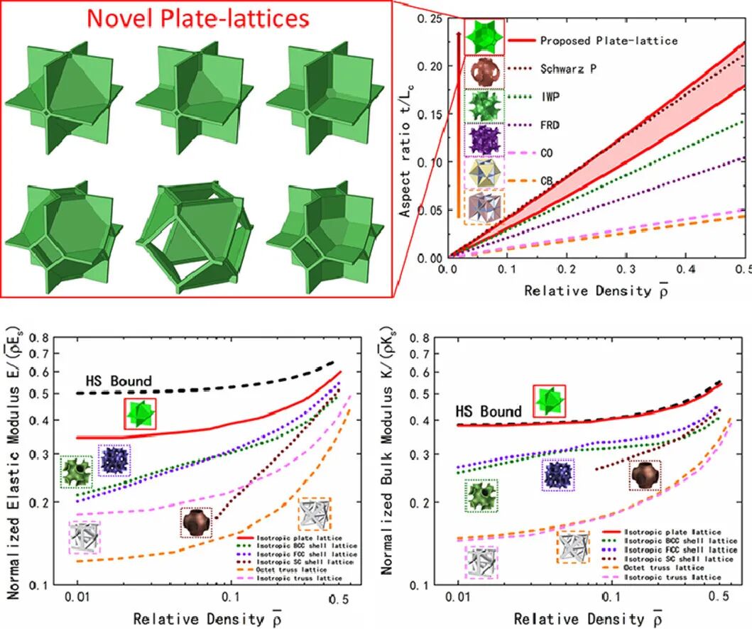 平板晶格是一类具有特殊机械性能的新兴超材料。在此,我们介绍了一种具有特殊力学性能,并且可以通过增材制造进行制备的半开放平板晶格。我们使用数值和实验方法研究了其弹塑性特性和大应变响应。通过对各向异性指数进行精细调,可以在较宽的相对密度范围内实现弹性的各向同性。数值结果表明,各向同性平板晶格的弹性特性明显高于传统拓扑结构,体模量可达到相对密度的Hashin-Shtrikman上界。大应变模拟证明了这种新型的平板晶格具有显著的能量吸收能力。我们通过对各向异性和同性的316 L不锈钢试样进行压缩实验,对数值计算结果进行了验证。综上,本研究提出了一种具有优异的机械性能和增材制造可加工性新型平板晶格,为轻量化超材料的设计提供了新的思路。
