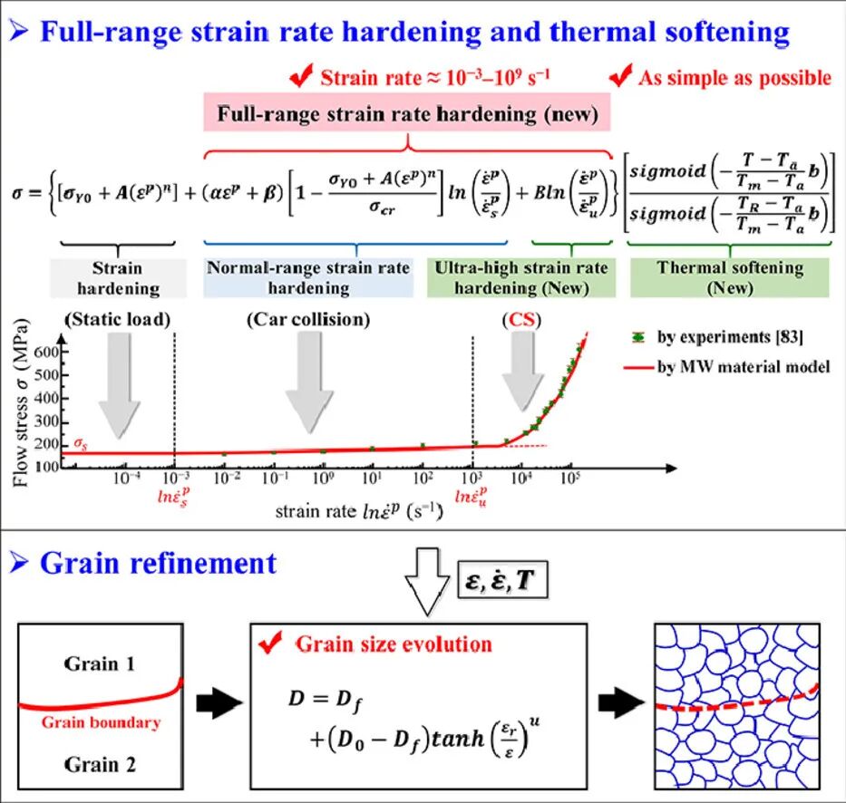 基于熔体的增材制造技术,如选区激光熔化、电子束自由成形等,往往会导致晶粒粗大和高孔隙率等问题。而冷喷涂的新技术可以克服这种熔覆引起的缺陷。在本研究中,我们建立了一种位错动力学模型用于描述以下五个纳米尺度的物理现象,即应变硬化、正常范围应变速率硬化、超高应变速率硬化、热软化和晶粒尺寸的演化。Cu粒子冲击试验的结果与模型预测的微粒变形吻合良好,表明模型精度较高。我们建立相应的有限元模型,单独讨论了上述现象的影响,发现材料变形主要由超高应变率硬化控制,而喷涂主要由热软化控制。另外,模拟和实验观测到的晶粒尺寸分布表明,晶粒细化只发生在微粒-基体界面附近(主要在界面边缘)。综上所述,我们的模型可以准确地再现冲击颗粒的动态变形行为,并正确预测晶粒细化(特别是由于动态再结晶)。