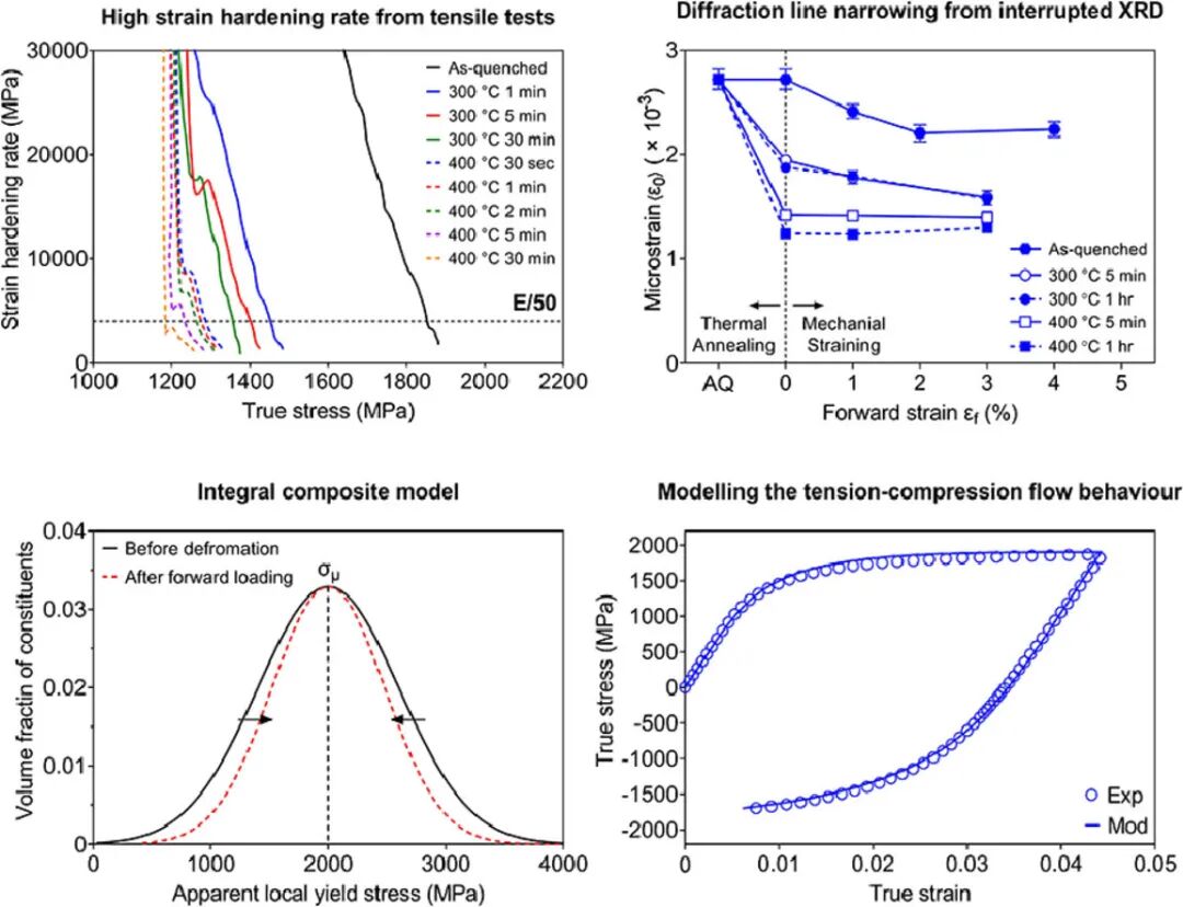 马氏体对先进高强钢的强度起到重要作用。虽然马氏体的强度已被广泛研究,但马氏体的低弹性极限和超高应变硬化率仍是学界的一个难题。虽然最近提出的复合模型可以成功地再现和解释由于微观组织不同相具有不同屈服强度或变形引起的残余应力而导致的逐渐屈服特征,但它们都不能自洽地描述淬火马氏体拉压行为中的关键特征。将这些复合模型扩展到回火马氏体的尝试非常有限。在这篇论文中,我们采用了机械测试(例如单轴拉伸-压缩)和间断性X射线衍射对淬火和回火马氏体的应变硬化进行了系统的实验研究。结果表明,淬火马氏体在拉伸过程中表现出的高应变硬化速率、包辛格效应和衍射峰变窄等现象在回火至400℃时仍能保持。通过将马氏体理解为一种多组分复合材料,在形变时具有变化的本征屈服强度和残余应力松弛,能够较好地理解以上实验现象。