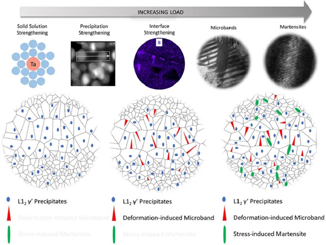 多组元体系高熵合金极大地扩展了合金设计的空间,并为克服合金的强韧性平衡提供了新的可能。然而,通过传统的晶粒细化和沉淀强化机制获得超高强度,必然导致塑性的急剧丧失。在此,我们设计并制备了一种具有非均匀层状结构的时效高熵合金,该合金能够达到千兆级别的抗拉强度,同时保持了优异的塑性(抗拉强度~1.4 GPa,延伸率~30%;抗拉强度~1.7 GPa,延伸率~10%)。我们的研究表明,强度和塑性的协同提高是由于各种强化机制的共同作用导致,包括固溶强化、界面强化、析出强化和马氏体相变强化。这些机制分别在不同应变水平下影响材料的硬化和变形过程。特别是,微形变带的形成和应力诱导马氏体相变导致了额外的应变硬化,提高了材料的塑性。本文所述的策略利用了异质微观结构设计的概念,为高性能结构材料的制造提供了一种实用而新颖的方法。