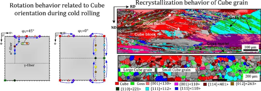 提高<100>//ND织构是制备高效无取向电工钢的关键。本研究通过新型双辊带钢连铸、冷轧和退火工艺成功地制备出了具有强立方织构({100}<001>)和高斯织构({110}<001>)的Fe-1.3 Si wt% 钢。我们使用光学显微镜、电子背散射衍射(EBSD)和X射线衍射(XRD)对材料的组织和织构进行了表征,从特定取向晶粒的变形和再结晶角度阐述了织构的形成机理。在冷轧过程中,晶粒除了向{001}<130>-{001}<120>方向旋转外,还向{013}<031>-{110}<110>方向旋转。此外,变形后的{115}<051>-{115}<161>晶粒中形成了新的立方变形带。重度冷轧后,保留下的立方织构部分成大块状、小条带状或微晶,立方变形结构成为新立方晶的形核位点。此外,{114}<110>、{112}<110>和{111}<112>基体中的剪切带也提供了一些立方形核位点。立方晶粒和高斯晶粒生长过程中,晶粒形貌由近棒状转变为等轴状。定向形核、定向钉扎和尺寸效应导致了再结晶织构的形成。较低的厚度和具有强{100}织构的粗大凝固组织是无取向电工钢铸带获得强立方织构和高斯织构的决定性因素。