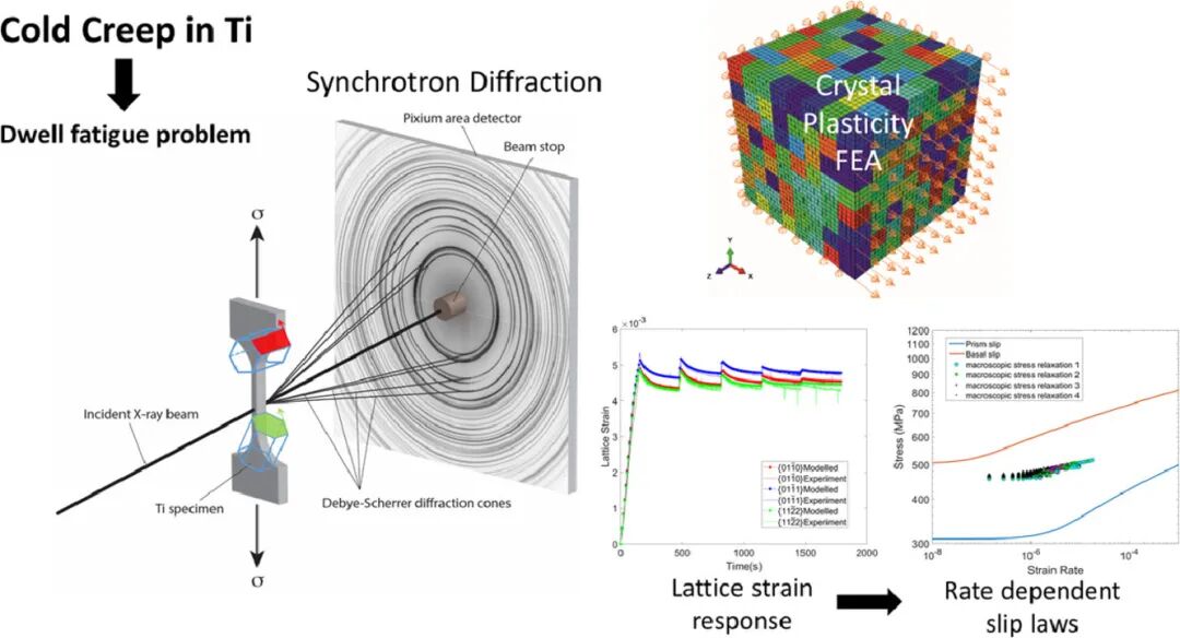 钛和一些钛合金会在室温条件下发生蠕变,导致疲劳寿命因应力驻留显著降低。一些研究者认为,容易发生塑性滑移的“软”晶粒与时间有关的塑性特征导致了载荷转移,从而增加了邻近不易发生塑性滑移的“硬”晶粒应力。量化与时间相关的塑性过程是成功预测低温疲劳的关键。在此,我们使用了同步辐射XRD技术对工业纯钛(等级4)在应力松弛实验中表现出的与时间有关的塑性特征进行了研究。基于衍射峰在不同载荷取向下的偏移对晶格应变进行了测量。我们通过晶体塑性有限元模型对晶格应变弛豫响应的模拟,确定了合金柱面和基面滑移的临界剪切应力、激活能和激活体积。柱面滑移拥有较低的临界剪切应力和(τcbasal= 252 MPa,τcprism= 154 MPa)和活化能(ΔFbasal = 10.5×10−20 J = 0.65 eV,ΔFprism = 9.0×10−20 J = 0.56 eV),因此更容易发生。与基面滑移相比,棱柱滑移参数对应变率更加敏感。这种与应变速率有关的滑移模式对低温疲劳过程中应力向“硬”晶粒的重新分布有显著影响。
