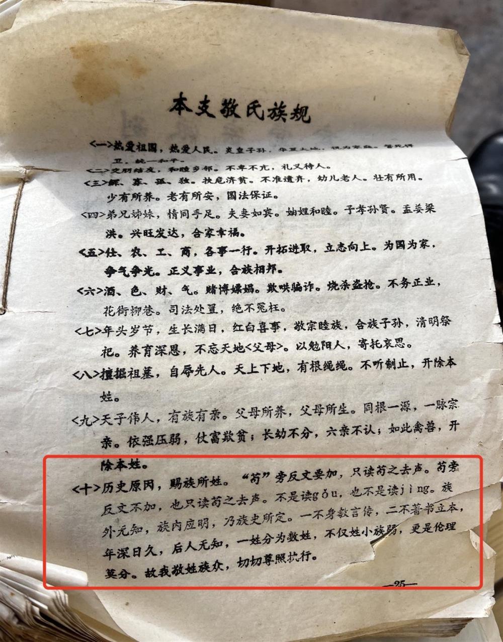 不过,这个“苟”也有历史出处,敬芳的家中族谱曾明确提到,因历史原因,赐族姓“敬”。“苟”旁反文要加,只读苟之去声。苟旁反文不加,也只读苟之去声,不读gǒu,亦不读jìng。虽然族谱中指出,“苟”作姓氏时应为第四声,但敬芳身边的绝大多数人还是将其读成了gǒu。因为姓氏读音的问题,敬芳在学习生活中自然也遇到了不少尴尬,后来慢慢地,她对外介绍时不再叫“苟芳”,而是“敬(jìng)芳”。