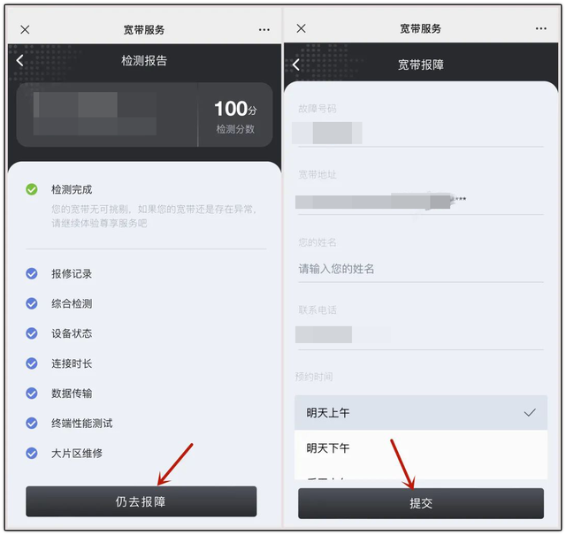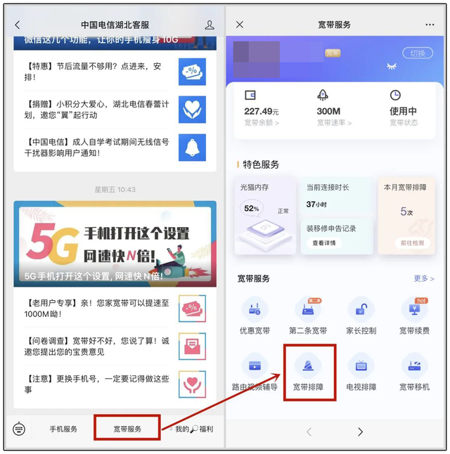 如果以上3种方法都不行,您可以到各省区的中国电信客服官方公众号,选择公众号菜单栏中的【宽带服务】—【宽带排障】进行自助排障。