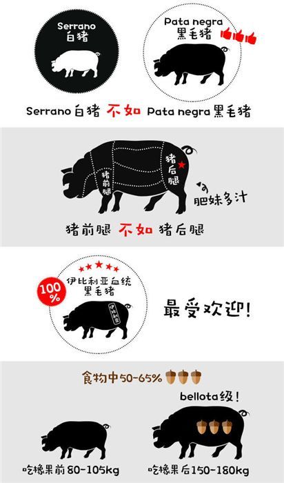 ·伊比利亚火腿必须由50%以上血统的伊比利亚黑蹄(Pata Negra)猪为原料,伊比利亚火腿窖藏期以,前腿24个月,后腿36个月为佳。