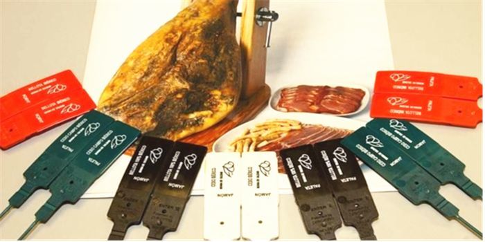 红标 -至少50%伊比利亚血统,放养,以谷物和橡果为食,红标火腿跟黑标主要区别就是猪的血统纯度,口感很难区分,但价格比黑标便宜10%左右。