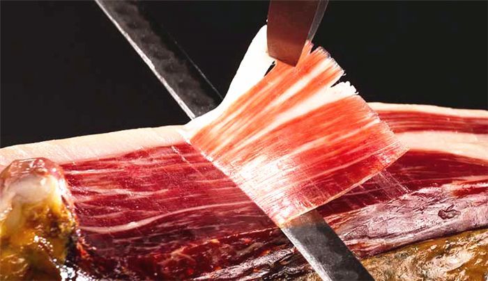 顶级火腿与日本和牛不分伯仲,瘦肉呈玫瑰红,其间均匀分布着白色的脂肪,大理石花纹的形容来源于此。浓郁芬芳的橡果味,从切片伊始便弥散开来,当新鲜切下来的火腿片达到室温,油脂会慢慢挥发包裹在肉表面。入口,薄如蝉翼的火腿片浓烈绵滑,融于舌尖。