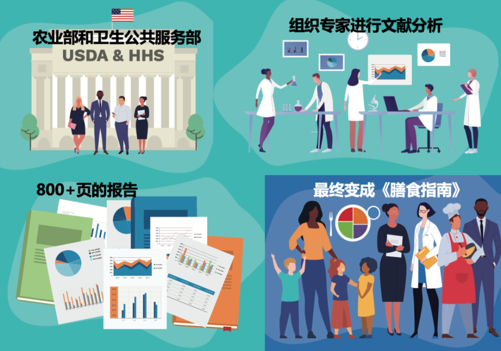 膳食指南是美国农业部(U.S. Departments of Agriculture, USDA)和卫生及公共服务部(Health and Human Services, HHS)负责推出的,至少每5年更新一次。每次指南的更新都是基于近几年的最新营养和公共卫生研究。膳食指南的初衷是统一指导所有和膳食相关的公共卫生项目,是所有营养相关研究项目和政策的基石,比如官方媒体如何指导膳食、给什么样的营养项目更多投入、如何建立更好的公共卫生项目都是基于膳食指南的。