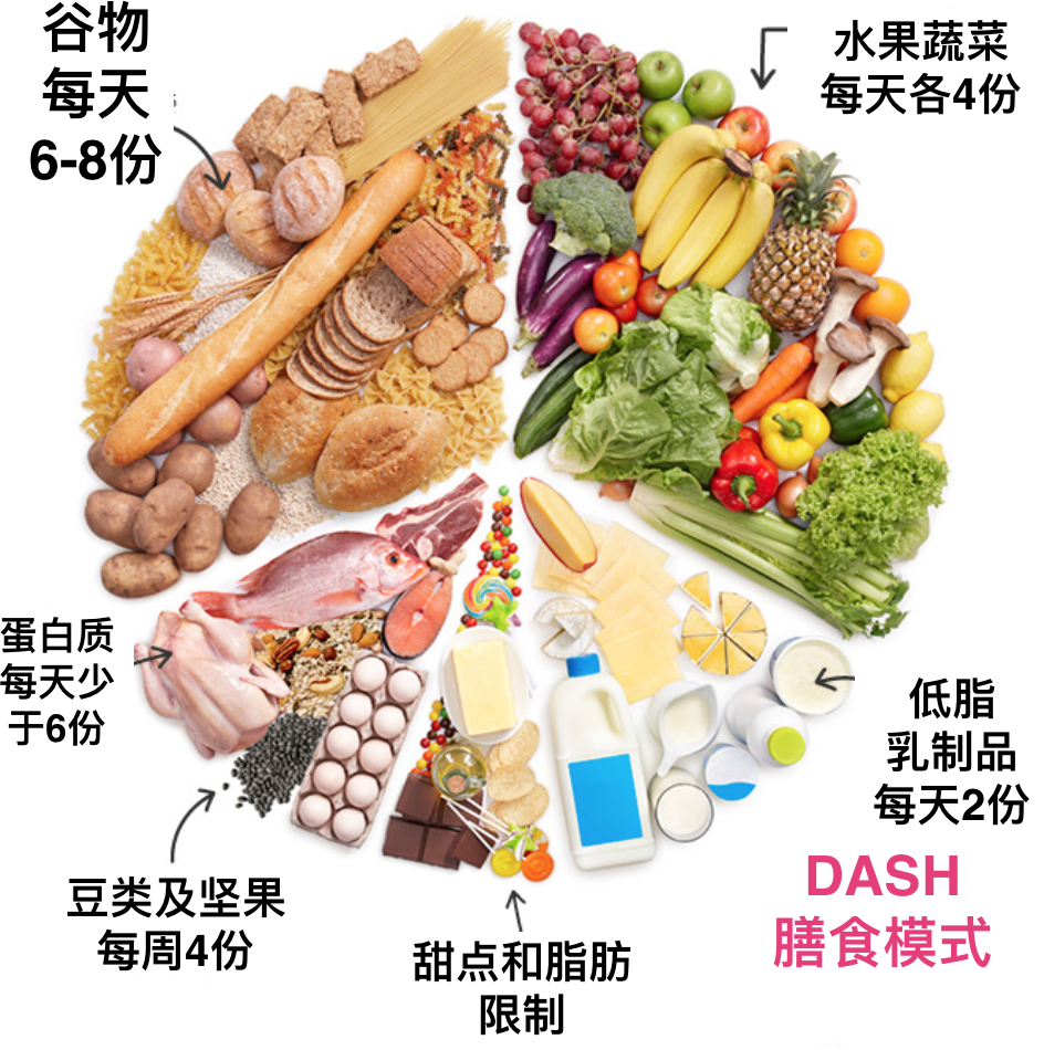 现在的营养研究已经发现了一些更健康的膳食模式, 比如之前文章中介绍的地中海膳食、DASH(终止高血压膳食模式)都是健康的膳食模式,它们的特点是不强调某一种食物或者营养素,而是指导人们怎么去搭配和选择食物。比如下面的图中就是DASH膳食模式,膳食模式强调的是膳食搭配而不是某种食物或营养素。
