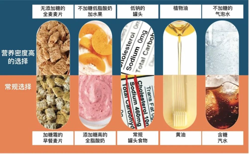 下图就是膳食指南中给出的用营养密度高的选择来替换常规食物的例子。