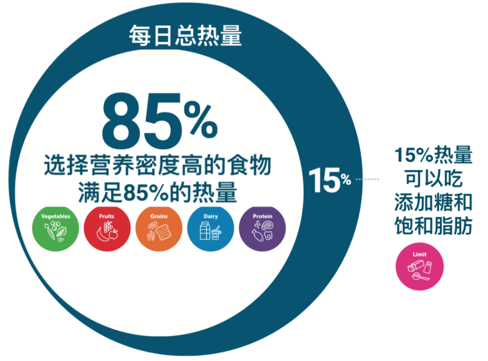的确,新的膳食指南承认了吃的社交意义,也知道完全避免添加糖、饱和脂肪等不健康的膳食成分在现代社会中几乎是不可能的,所以提出了85%-15%原则,认为成年人可以用85%的热量限额来吃健康的食物,而把15%的热量限额留给“不健康”的“好吃的”。