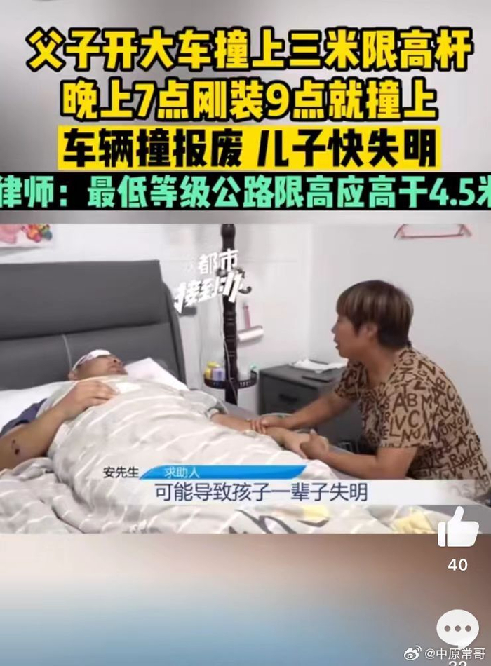 【#安阳父子开大车撞上限高杆车报废人重伤#】#安阳身边事#7月13日,河南安阳。安先生向记者求助,说半个月前他与28岁的儿子遭遇了一场车祸,给他们家庭带来了沉重的打击。在6月22日,安先生开着自己的运输车辆拉着一车小麦,在经过浚县的一个红绿灯之后,只听突然“砰”的一声,安先生就失去了意识。安先生28岁的儿子也称是同样的遭遇,他当时在副驾驶玩手机,一下子就没了意识,再醒来就在医院了。经过询问,原来是事故原因是路上新设置的一个3米的限高杆,据附近村民称,这个限高杆在晚上7点多刚装上,9点多安先生父子就撞上了。这次事故造成了安先生胸腔骨折,头部撞开十几公分的口子,安先生的儿子右脸粉碎性骨折,右眼几近失明。而记者在现场也发现来来往往的大车是比较多的,安先生称,所有大车车高都是超过三米的,哪怕是他不撞上,其他人也会撞上,因此安先生希望知道是谁安装的限高杆,给他一个说法。