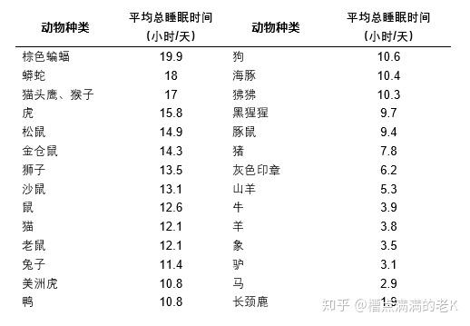 早在1984年瑞士苏黎世大学的CAMPBELL和TOBLER就发表过168种动物的睡眠时长和模式报告。Howard Zepelin在1989年发布了下面关于各种哺乳动物的每日所需睡眠时间的观察研究报告,显示了从长颈鹿到棕蝙蝠的各种物种的睡眠需求和决定睡眠时长的主要因素是代谢率,和后来科学通过脉络膜计算的结果完全一样。