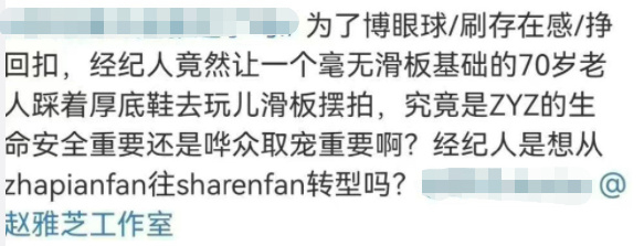 微博上的评论都是“你为什么不优雅地老去?”我只好道歉。因为我现在优雅不了,暂时也老去不了。不愿意优雅老去的,不止刘晓庆一人。69岁的赵雅芝曾晒了一组自己戴棒球帽玩滑板的美照,也让网友大吃一惊。除了滑板,她之前还分享过射箭、打篮球、开卡丁车的运动型照片。网友只觉得赵姐很年轻很会玩,但粉丝却先不答应了,公开声讨团队为了博眼球,让快70岁的人踩着厚底鞋去摆拍这么危险的动作,太不顾及偶像的生命安全,实属哗众取宠。