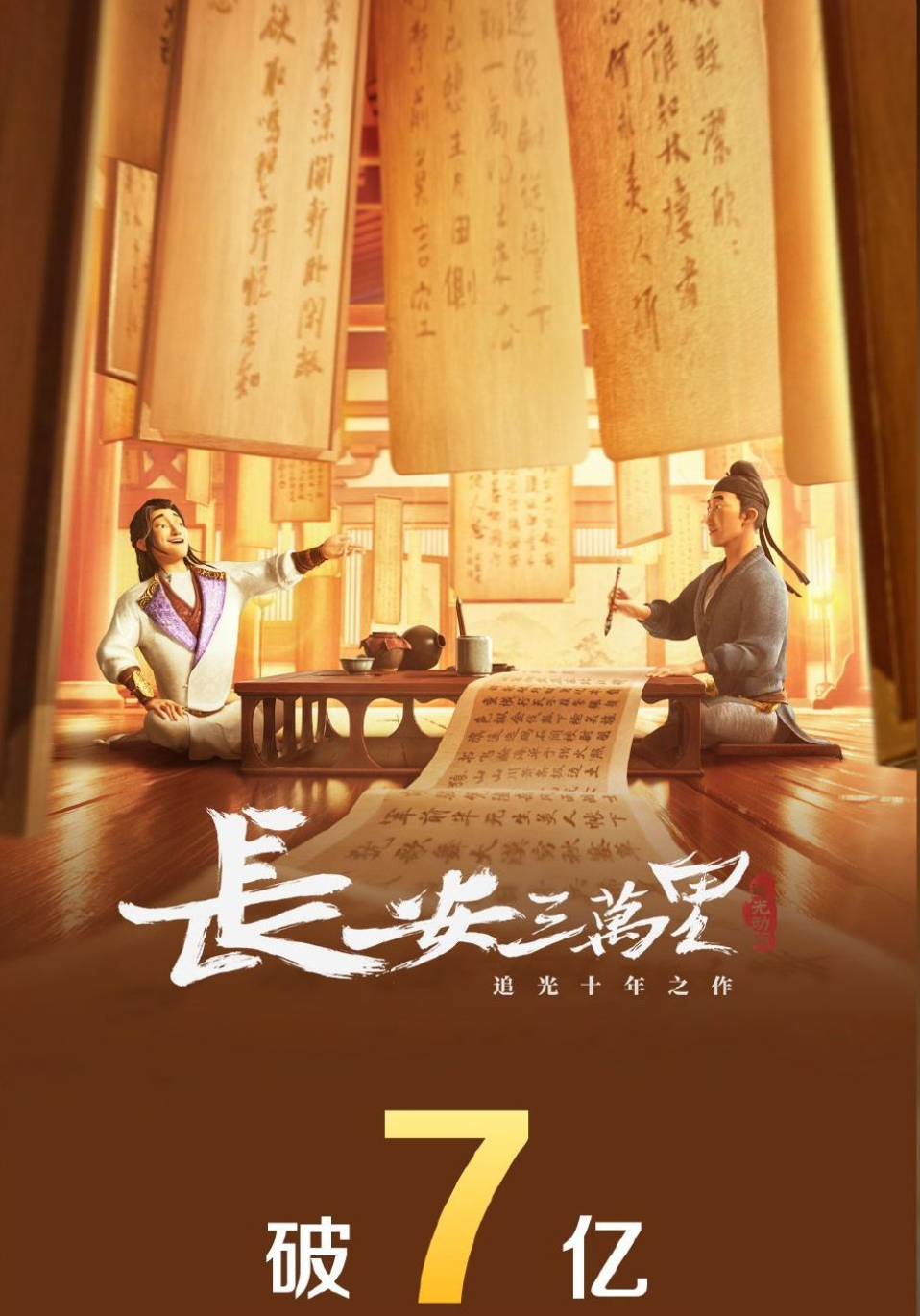 电影上映至截稿时间,票房已经破7亿,其实《长安三万里》上映第一周口碑一般,从第二周开始口碑发酵,连续两天票房破日,单日票房超过《八角笼中》成为日冠。