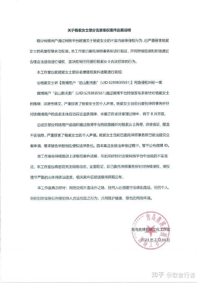 随后,还发布了关于杨紫部分名义维护案件的进展说明。