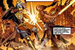例子1:漫画《Vector》。《Vector》是一个不无创意的项目,横跨多个发生在不同年代的星战故事,包括《旧共和国武士》(Knights of the Old Republic)、《黑暗时代》(Dark Times)、《反抗军》(Rebellion)、《传承》(Legacy)。所以这个故事本身能组成一个整体,但同时又能拆分在不同系列的故事下。根据这种设定,我们明白了“Vector”的含义——“向量”,一个数学、物理学名词,其中最重要的一个特色是具有方向性。在漫画中,“Vector”暗指是主人公穿越时空历险的生平,她的人生不停地向未来前进。