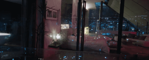 女孩一个回眸,惊恐的样子被雷电映射在大楼玻璃窗上。