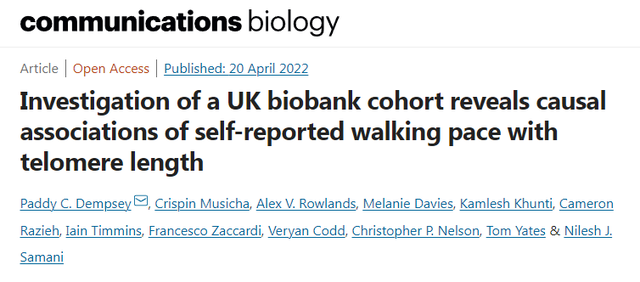 2022年4月20日,英国莱斯特大学的研究人员在 Nature 子刊" Communications Biology "上发表了一篇题为" Investigation of a UK biobank cohort reveals causal associations of self-reported walking pace with telomere length "的研究论文。