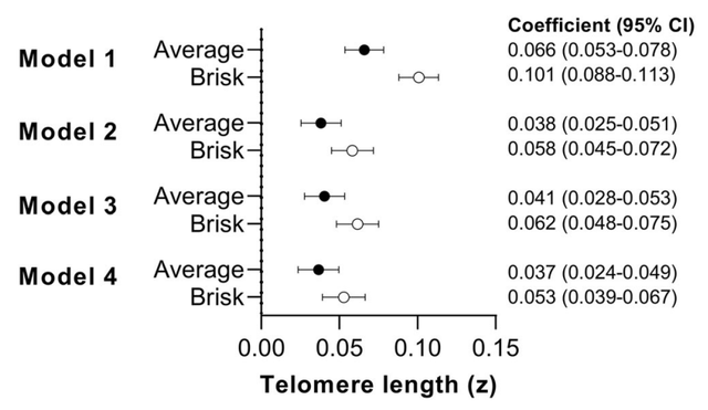 分析发现,与慢速步行者相比,中等速度步行和快速步行者的端粒明显更长。