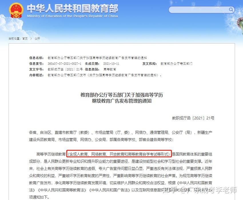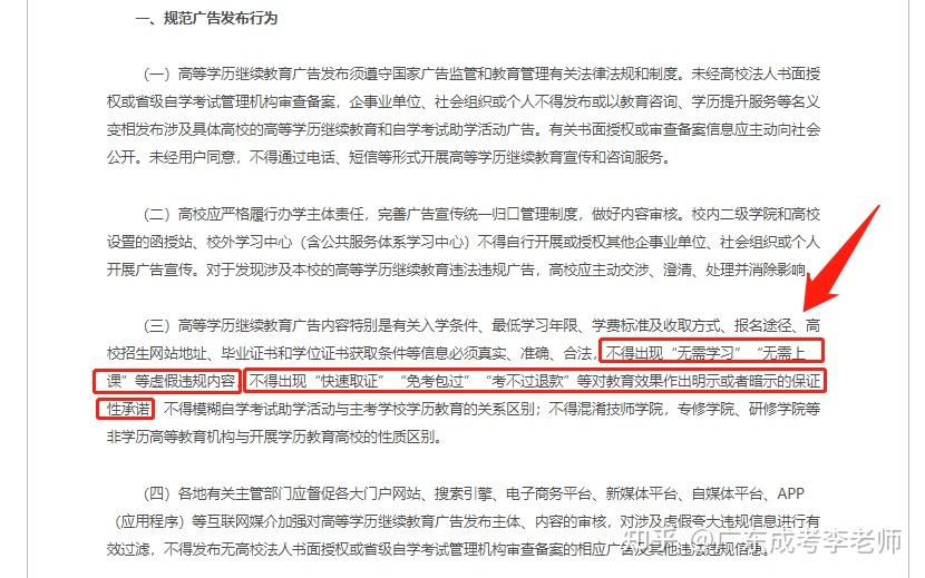 今年10月国家教育部已经着手规范所有学历教育机构,所有广告不得出现“无需学习”“无需上课”等虚假违规内容,不得出现“快速取证”“免考包过”“考不过退款”等对教育效果作出明示或者暗示的保证性承诺。