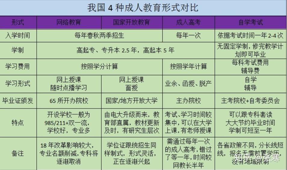 给同学们科普一下:成人教育分为4种学历形式。自考成人高考网络教育开放教育
