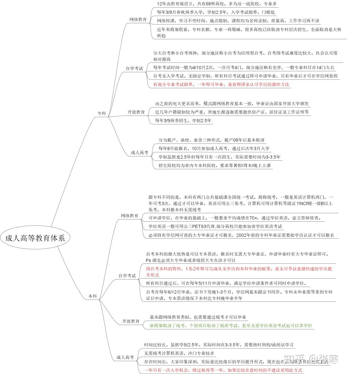 其中网络教育,有高起专(高中到专科)、专升本(专科升本)、高起本三个层次,学制分别是2.5年、2.5年、5年(等于高起专+专升本的时间),每年3月9月两季招生。开放大学,跟网络教育基本是完全一样的模式,只是发证院校不同,同样有高起专(高中到专科)、专升本(专科升本)、高起本三个层次,学制分别是2.5年、2.5年、5年(等于高起专+专升本的时间),每年3月9月两季招生。成人高考,同样有高起专(高中到专科)、专升本(专科升本)、高起本三个层次,学制分别是2.5年、2.5年、5年(等于高起专+专升本的时间),每年仅有一次全国统一考试,在每年10月。自考,只有高起专、专升本两个层次,无固定学制,完成课程设置内要求的考试安排即可申请毕业,所以时间可能很长(一直考不完、考不过)或者很短(比如小自考或者某些特定项目,甚至可以做到7个月毕业)