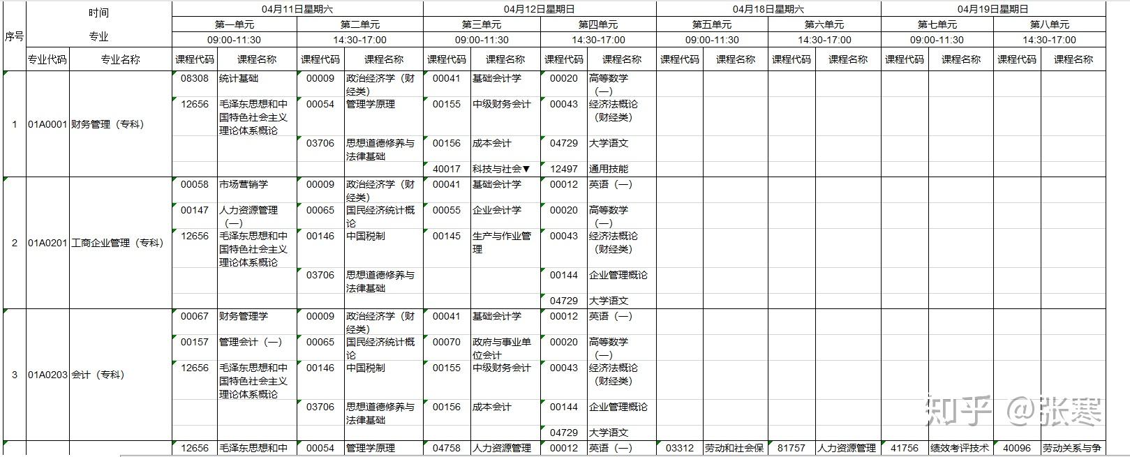 下载后可得4月和10月的考试计划安排表,查阅可知,只有极少数专业是可以考2周的,绝大部分都是单周考试